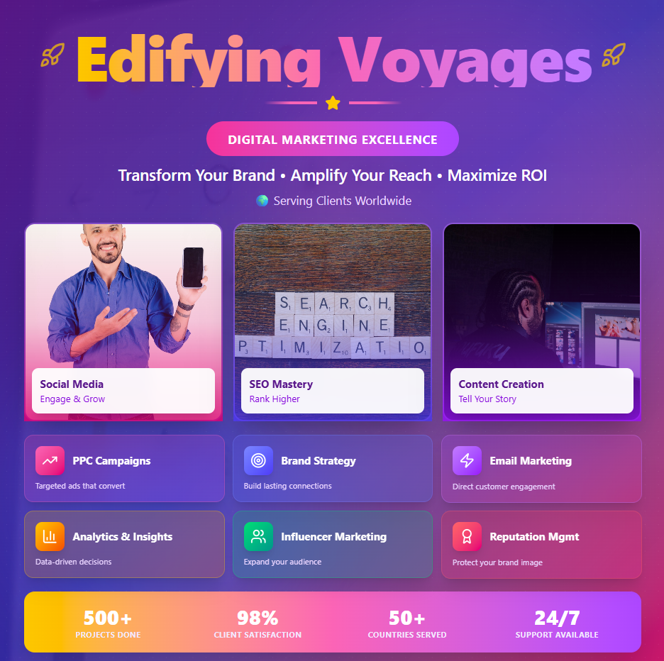 As a leading oxford seo company, Edifying Voyages helps brands achieve higher search engine rankings and increased online exposure. Our comprehensive approach includes competitor analysis, technical optimization, high-quality content creation, and ethical link-building strategies. We work closely with clients to ensure every campaign is aligned with business goals and focused on generating sustainable traffic and higher conversion rates.